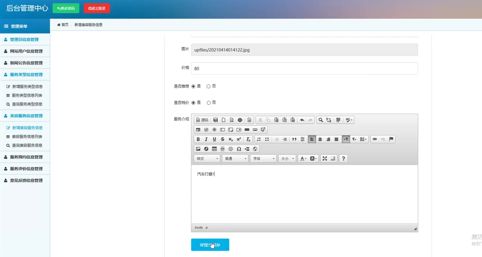 汽车保养预约及美容服务管理系统(ssm,mysql) 包含内容: 源码,数据库(详情见网页下方截图) 作者QQ1420527913 下载源码 详情描述 如遇视频不清晰,请最大化观看演示 官网:http://www.ckplayer.com,版本号:X 以下仅列出部分功能,全部功能请至官网 《手册》查看 播放 暂停 播放/暂停 静音 取消静音 清除视频(仅flashplayer) 获取元数据 添加元件 删除元件 添加弹幕 视频截图(需要视频权限) 播放器截图(需要视频权限) 暂停广告(仅flashplayer) 继续播放广告(仅flashplayer) 关闭(结束)广告(仅flashplayer) 显示控制栏 隐藏控制栏 默认角度 顺时针旋转 逆时针旋转 旋转90 旋转180 旋转270 旋转-90 旋转-180 旋转-270 默认大小 放大 缩小 默认速度(仅H5) 0.5倍(仅H5) 1倍(仅H5) 2倍(仅H5) 正常拖动 不能拖动 只能前进(向右拖动) 只能后退 能回到第一次拖动时的位置 看过的地方可以随意拖动 原始比例(仅flashplayer) 4:3(仅flashplayer) 16:9(仅flashplayer) 调整亮度(仅flashplayer) 恢复亮度(仅flashplayer) 调整对比度(仅flashplayer) 恢复对比度(仅flashplayer) 调整饱和度(仅flashplayer) 恢复饱和度(仅flashplayer) 调整色相(仅flashplayer) 恢复色相(仅flashplayer) 播放 播放 单独监听功能: 播放状态: 跳转状态:无 缓冲:100 当前音量:0.8 是否全屏:否 控制栏:显示 还未结束 当前播放时间(秒):0 前置广告状态: 鼠标位置 切换清晰度: 点击监听: 监听截图功能 Custom Tab